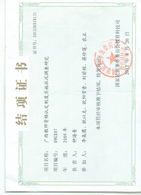 上一条:民族边境地区教育特色发展实证研究(桂教科学[2009]7号) 下一条:广西民族教育质量保障与特色发展研究(编号:201202ZD034)
